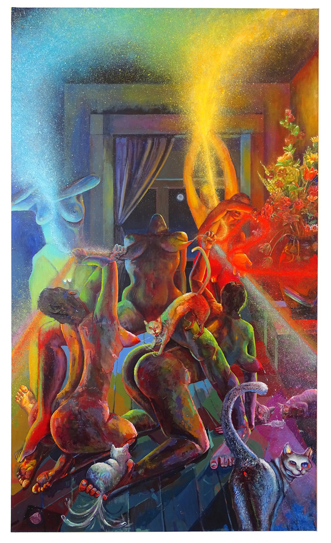 *There is a small cut out hole on the surface where the cat's mouth is. You can look insdie and move a sliding platform inside from left to right by pulling on ribbons on the side.