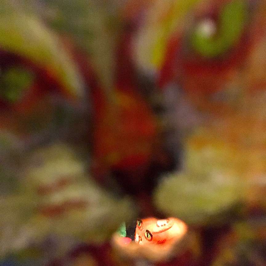 *There is a small cut out hole on the surface where the cat's mouth is. You can look insdie and move a sliding platform inside from left to right by pulling on ribbons on the side.